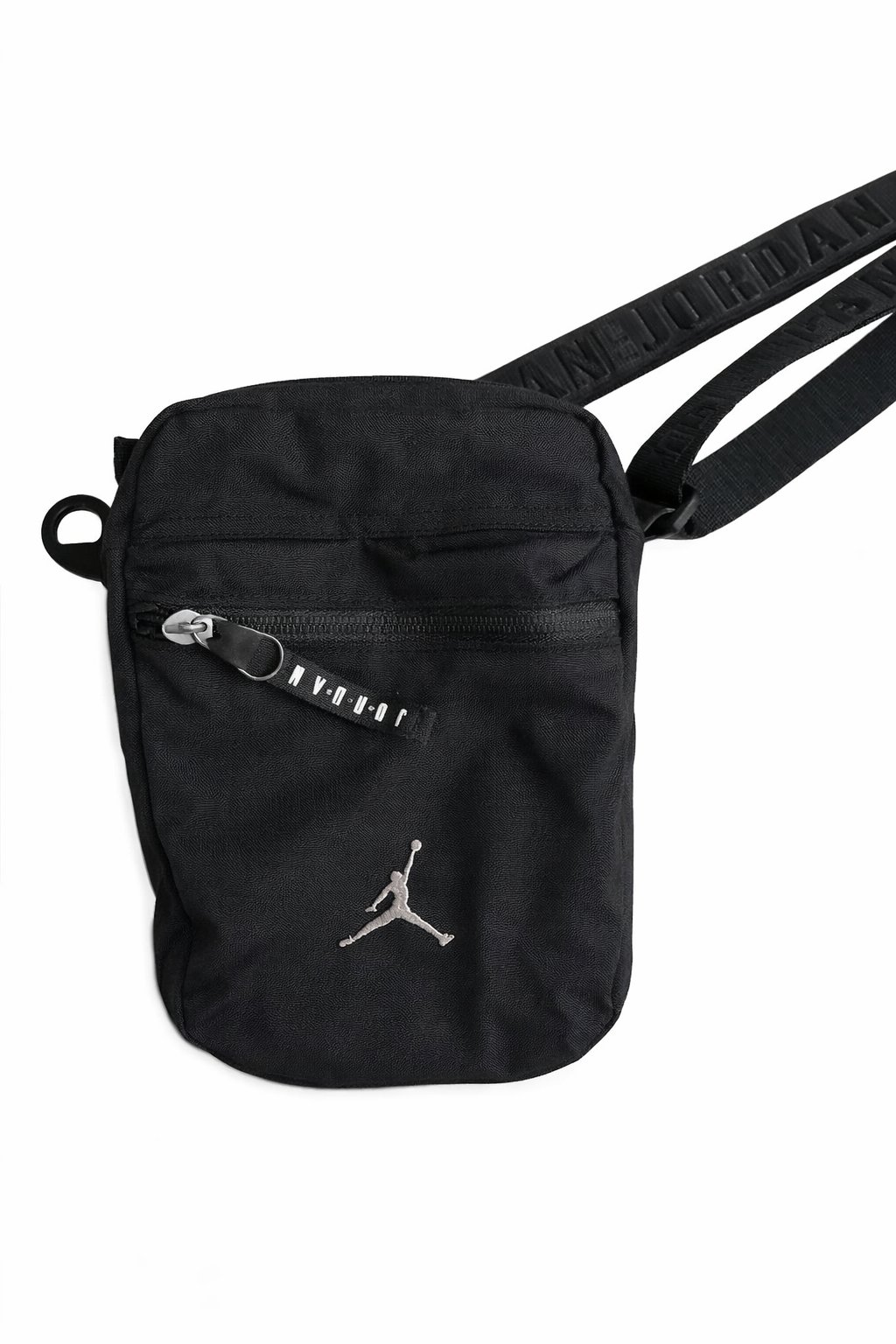 Nike Air Jordan Jumpman crossbody bag in black. Compact and practical everyday bag with adjustable shoulder strap and front zip pocket. Perfect for festivals, travel, or daily use.